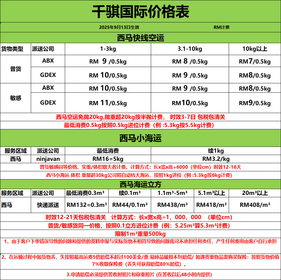 西马运费报价2025年9月13日执行